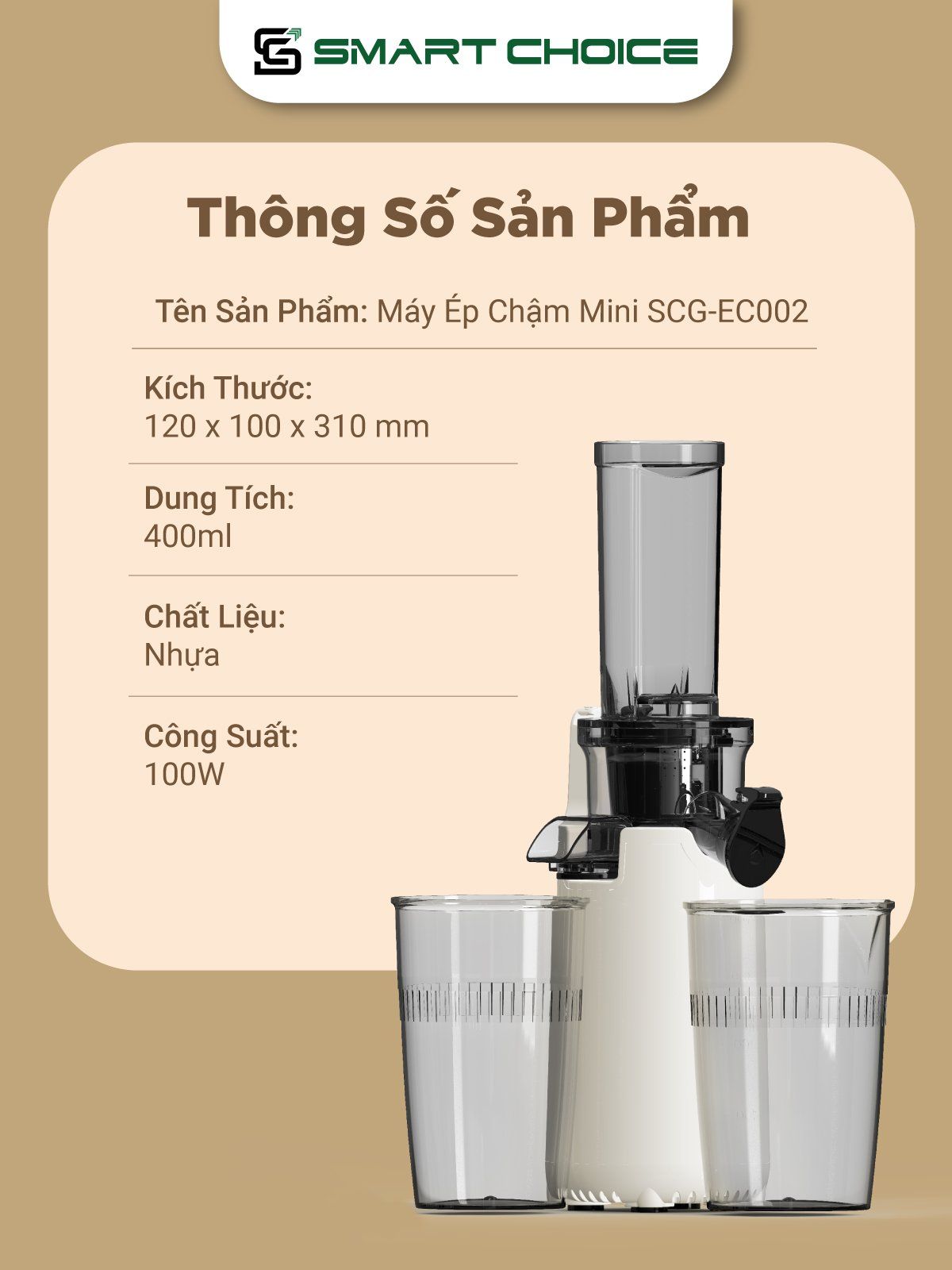 Với những tính năng ưu việt và chất lượng vượt trội, máy ép chậm SmartChoice SCG-EC002 có mức giá rất hợp lý, phù hợp với túi tiền của đa số người tiêu dùng. Đây là sự đầu tư thông minh cho sức khỏe và tiện nghi cuộc sống của bạn.